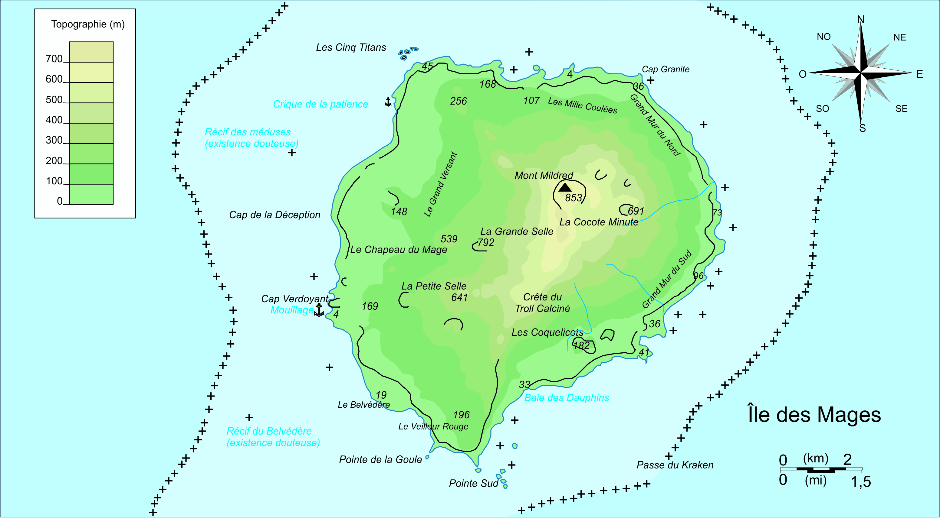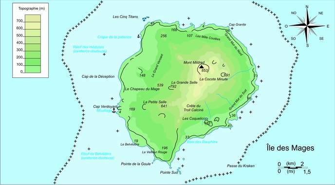 L'île est entourée d'une barriere de corail située à 2 à 3 kilomètres du rivage de l'ile, barrière qui ne peut être traversée qu'en un seul point, au sud-est de l'ile : la Passe du Kraken se trouve plein est des petits ilets au sud de l'île, et ne peut être traversée que par temps calme, à marée haute, par un navire de moins de 3 mètres de tirant d'eau. A l'extérieur de la barriere la profondeur supérieure à soixante-dix metres rend le mouillage difficîle ; derriere la barriere coralienne le fond rocailleux et sabloneux est d'une dizaine de mètres. Plusieurs fissures sous-marines dans la barrière coralienne, constituent un dédale complexe, qui permettraient à un kraken de passer d'un côté à l'autre de la barrière coralienne comme il le voudrait. Il pourrait demeurer dans une grotte aménagée dans le tombant ouest, qui communique avec la barrière de récifs. Si les krakens existaient, et s'il y en avait un dans les environs. Car à part de très vieux marins édentés qui ont perdu la raison, qui croit de telles légendes ?...